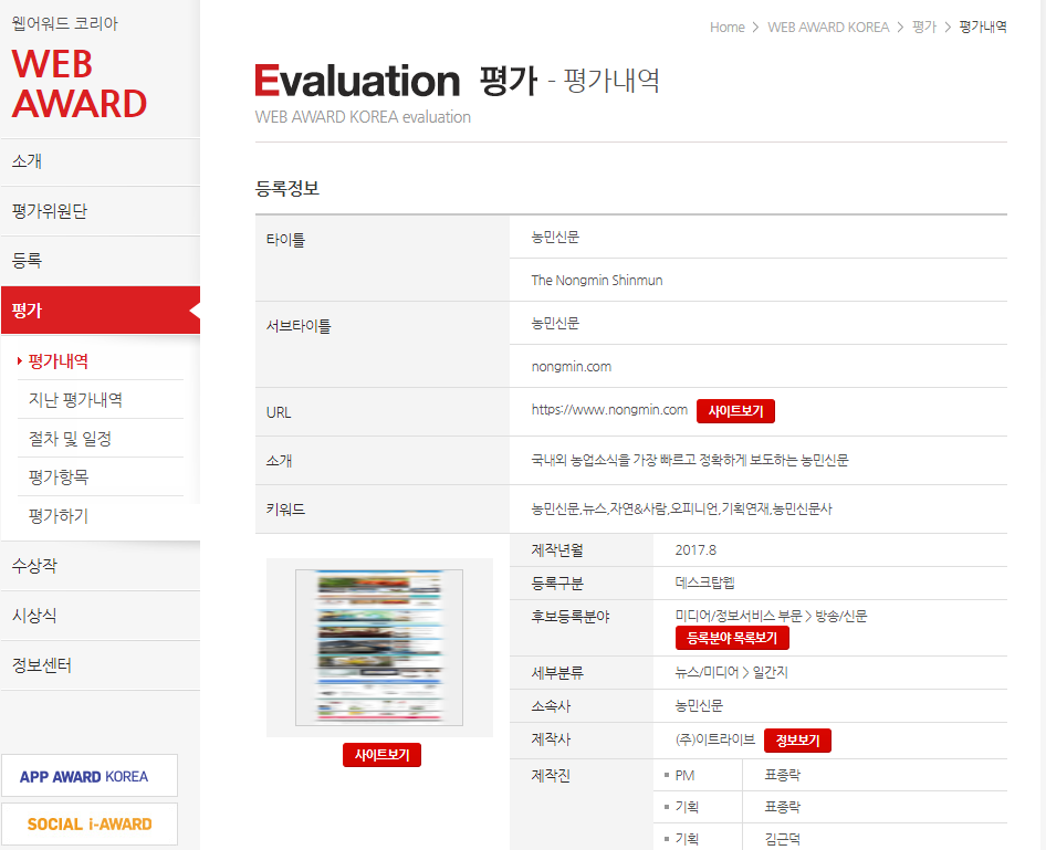2017년 11월 농민신문 홈페이지 제17회 웹어워드 방송/신문분야 대상 수상 |