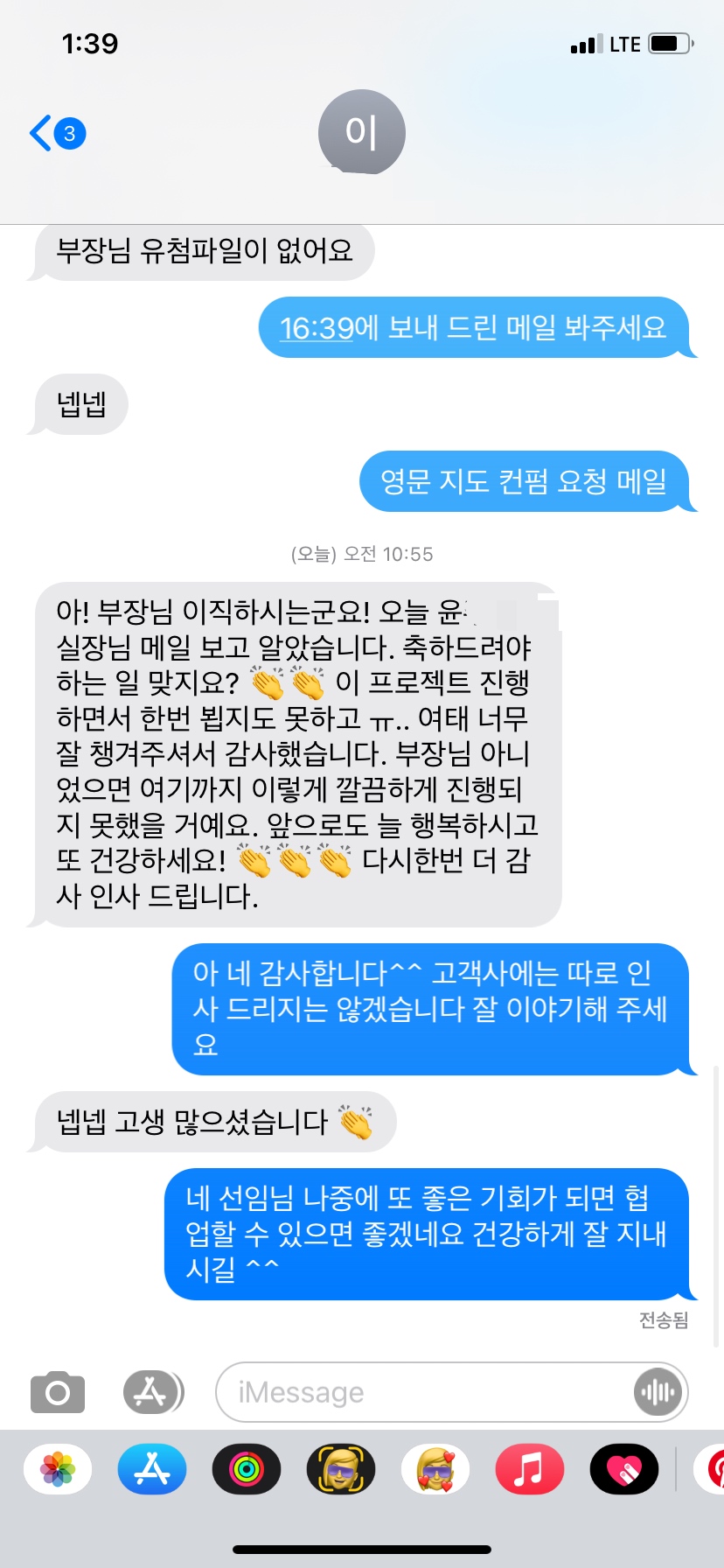발주사 담당자에게 문자로 인사를 서로 주고 받았다