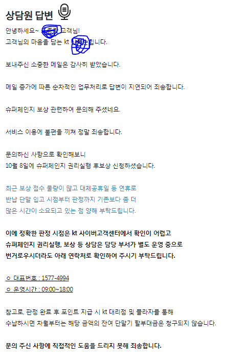 그리고 대리점에서는 10/12 아이폰 11을 회수하고, 자체 검수 후 KT 본사 그린폰 센터로 보냈다고 합니다. 대리점에 문의하니 본사로 보냈고 회신을 기다리고 있다고 하고, 답답해서 KT 고객센터에 문의하니 다음과 같은 답변이 왔네요.